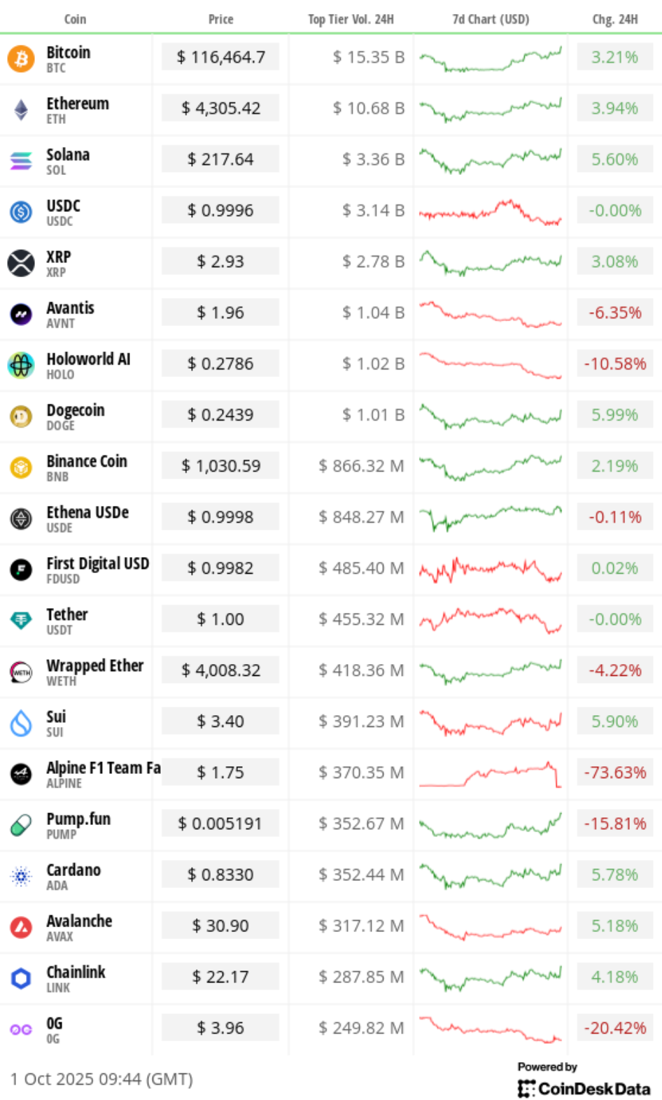 Bitcoin jumped 3% this morning, trading above $116,000, with the broader crypto market also up more than 3%. The surge came despite the US government shutdown, which began after policymakers failed to agree on a budget. This means non-essential federal services stop, federal employees may be furloughed without pay, and some government operations, like processing certain data, permits, or reports, are paused. Essential services like national security and public safety continue. The broader US stock market has so far shrugged off the uncertainty, but analysts caution that Friday’s jobs report could be affected if the shutdown persists.