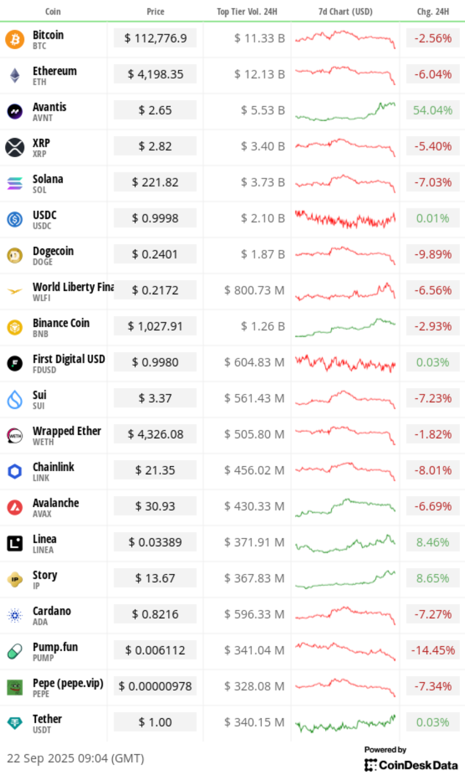Crypto markets took a sharp dive this morning, with Bitcoin down 2.6% and trading around $112,600. Others like Ethereum (ETH), XRP (XRP), and Solana (SOL) each shed more than 5%.